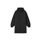 The Tech Nylon Hooded Parka (Vintage Black) from Fear of God Essentials is a modern outerwear staple that combines functional performance with elevated minimal design. Crafted from a premium tech nylon and spandex blend, the parka offers comfortable stretch and water-repellent protection, making it ideal for transitional weather. Designed in a relaxed, elongated knee-length silhouette, it features a sculpted scuba hood and a full zip front for enhanced coverage and versatility. A metallic 3D-printed "Essentials" graphic on the back adds a subtle reflective statement, complementing the clean, contemporary aesthetic. Practical details include side seam pockets and an adjustable waist hem with bungee toggles for customizable styling. The look is finished with a signature Fear of God Essential rubberized label stitched at the center front, reinforcing the brand's understated luxury and modern identity.