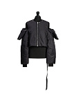 The Convertible Jacket in black by DRKSHDW, designed by Rick Owens, showcases the brand's signature avant-garde approach. It is crafted from lightweight recycled nylon and has a cropped waist-length silhouette. The jacket has long sleeves, a central front zipper, and a removable high funnel collar with snap fastenings. Once detached, the collar reveals a ribbed edge and visible snaps. Additional functional details include shoulder snaps, internal snap pockets, and a cotton webbing strap across the back. This piece is fully lined and made in Italy using sustainable materials certified by GRS.